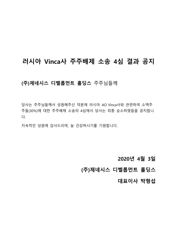 러시아 Vinca사 주주배제 소송 4심 결과 공지