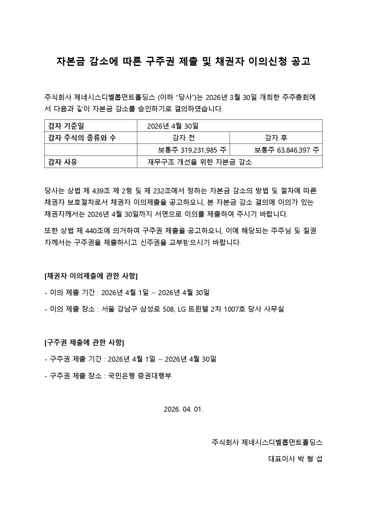 Genesis Development Holdings 주주 여러분께 드리는 말씀