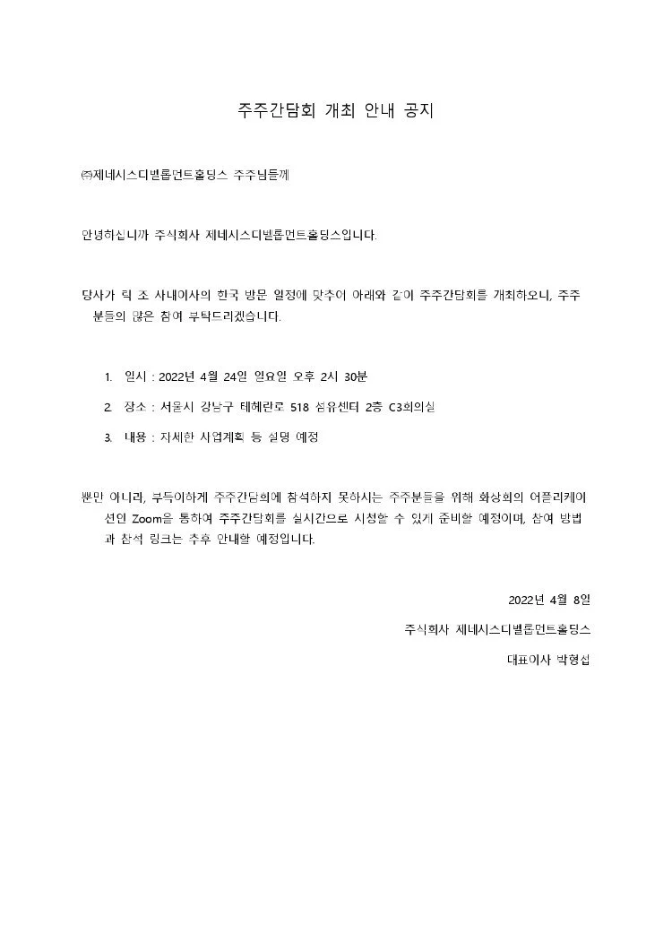 (주)제네시스디벨롭먼트홀딩스 외국인투자자 투자 취소 공지